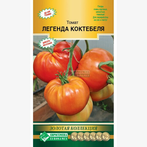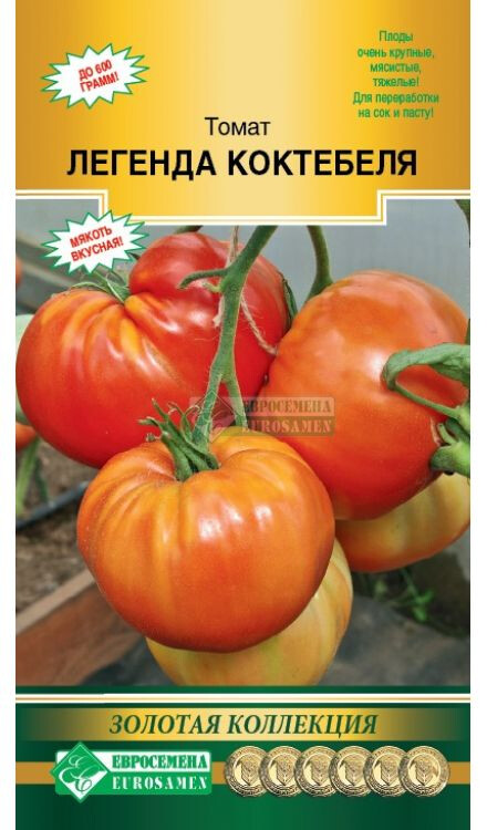 Трудно найти человека, который бы не любил томаты. Один только вид блестящих красных, оранжевых, желтых, двухцветных томатов вызывает аппетит и поднимает настроение. Помидоры вкусны и полезны! Легенда Коктебеля- удивительный, поражающий весом плодов, среднеранний томат индетерминантого типа с мощными кустами. Вступает в плодоношение через 110-115 дней после всходов. Первое соцветие закладывается над 8-9 листом, последующие соцветия через 2-3 листа. Простые и полусложные кисти могут содержать до 5-6 ярко-красных плодов массой по 400-600 г каждый! А если в кисти оставлять по 2-3 плода, то их масса может достигать 1,5 кг! Томаты многокамерные, очень мясистые и вкусные. Прекрасно подходят для свежего потребления, а также для переработки на сок и пасту. Формировка в 1-2 стебля с обязательной подвязкой кистей.