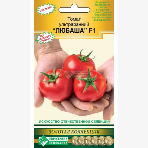 Ультраранний, от всходов до созревания 70-75 дней. Соцветие простое с 7-8 плодами. Первое соцветие закладывается над 5-6 листом. Плод округлый и плоскоокруглый, гладкий, плотный, красный, без зелёного пятна у плодоножки, массой 110-130 г с отличными вкусовыми качествами. Отличается дружностью плодоношения в любых условиях выращивания. Устойчив к растрескиванию и вершинной гнили плодов, толерантен к ВТМ, альтернариозу и фитофторозу. Норма высадки 5,5-5,7 растений/м2 с формировкой в 2-3 стебля. Рекомендуется для раннего производства томатов в открытом грунте. Урожайность F1 Любаша в открытом грунте 9,0-11,5 кг/м2 в пленочных теплицах 13,5-15 кг/м2. Плоды томатов богаты витаминами, содержат фолиевую кислоту, каротин, провитамин Д и оказывают положительное воздействие на организм.