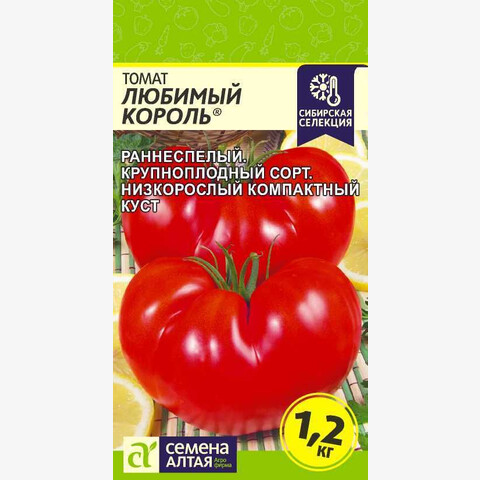 Селекция Агрофирмы Семена Алтая. Раннеспелый (95-100 дней) сорт. Растение детерминантное, куст компактный - 50-70 см. Плоды ярко-красные, плоскоокруглые и округлые, массой до 1,2 кг. В одной кисти формируется 3-5 плодов. Замечательный сорт для салатов и соков. Место посадки: легкие плодородные нейтральные почвы. Выращивают после моркови, капусты, свеклы, бобовых и тыквенных культур Освещение: обильное, переносит легкое затенение Предпосевная подготовка: для стимулирования прорастания перед посевом семена томата замочить на 15 минут в 1% растворе марганцовки, затем промыть и подсушить Сроки посева: раннеспелые сорта высевают за 45-55 дней до высадки (март) Посев на рассаду: высевают на слегка утрамбованный грунт, мульчируют торфом или почвенным слоем 1 см, уплотняют, обильно поливают теплой водой, накрывают пленкой и ставят в теплое (около 25°С) место. После появления всходов пленку снимают, рассаду размещают в светлом месте. В течение 5-7 суток температуру поддерживают на уровне 15-16°С, затем повышают до 20-22°С Посев в грунт: не предусмотрено для большинства регионов Пикировка/перевалка: в фазе 2 настоящих листьев рассаду пикируют. В фазе 8-9 настоящих листьев высаживают в защищенный или открытый грунт с соблюдением минимального посадочного расстояния 40х40 см Уход: детерминантные томаты выращивают с формировкой в 3-4 стебля или без формировки. В период налива плодов рекомендуется произвести калийную подкормку Сбор урожая: собирают в течение сезона по мере созревания. Недозревшие плоды в фазе молочной спелости могут дозариваться не на растении