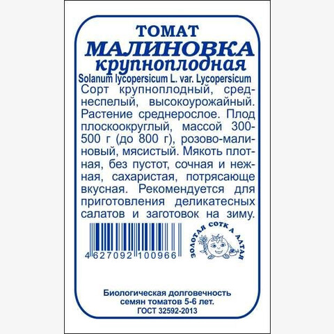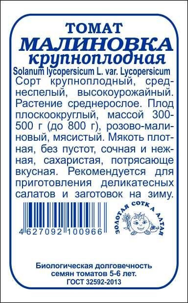 Крупноплодный высокоурожайный сорт. Период от массовых всходов до начала созревания 110-115 дней. Растение среднерослое. Плоды красивой розово-малиновой окраски, плоскоокруглые, массой 300-500 г (отдельные до 800 г), мясистые. Мякоть плотная, без пустот, сахаристая, потрясающе вкусная. Сорт рекомендуется для непосредственного потребления, приготовления деликатесных салатов, консервирования и переработки на томатопродукты.
