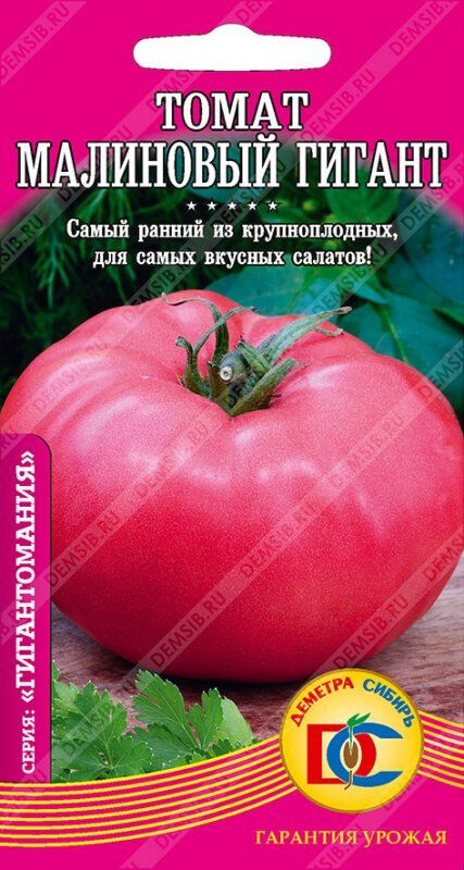 Популярный раннеспелый (105-110 дней) сорт. Рекомендован для открытого грунта и временных укрытий. Куст детерминантный, раскидистый, высотой до 100 см. Плоды плоскоокруглые, красно-малиновые, массой до 800 гр., сочные, мясистые. Преимущественное использование салатное. Плоды отличаются превосходным вкусом и высокими диетическими свойствами.