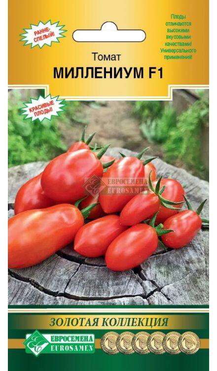 Трудно найти человека, который бы не любил томаты. Один только вид блестящих красных, оранжевых, желтых, двухцветных томатов вызывает аппетит и поднимает настроение. Помидоры вкусны и полезны! Миллениум - раннеспелый индетерминантный гибрид томата с укороченными междоузлиями. С момента полных всходов до первого сбора плодов проходит 95-100 дней. Первая кисть закладывается над 7-8 листом, последующие кисти – через каждые 2 листа. Кисти простые, содержащие по 6-10 плодов кубовидной формы с носиком. Плоды гладкие, очень плотные, массой 90-110 г. Окраска томатов в технической фазе спелости молочно-зеленого цвета, в биологической спелости – ярко-красная, без зеленого пятна у плодоножки. Плоды отличаются высокими вкусовыми качествами, высокой степенью выравненности, и пригодны для потребления в свежем виде, переработки на томатопродукты и консервирования.