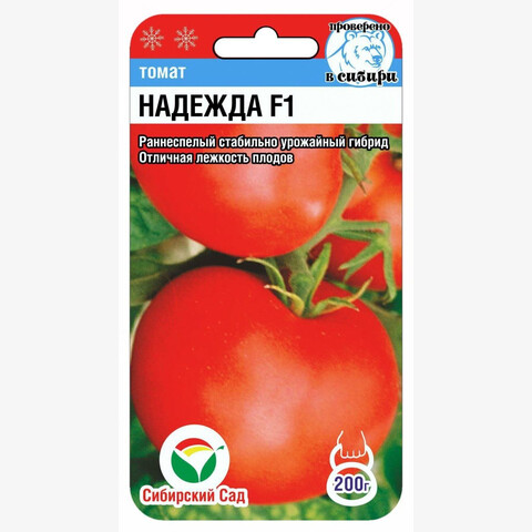 Представитель серии современных гибридов нового поколения, позволяющих получать суперурожаи в условиях открытого грунта и пленочных теплиц. Плотность и транспортабельность этих гибридов ничем не хуже зарубежных аналогов, а вкус кардинально отличается от своих пластмассовых собратьев. Гибриды заняли прочные позиции на рынке и любимы как производителями, так потребителями за прекрасную урожайность и великолепные вкусовые качества. Гибрид Надежда F1 раннеспелый (от всходов до начала созревания плодов 95-98 дней). Растение детерминантное, высотой 100-130 см. Плоды плоскоокруглые, плотные, массой до 200 г, не растрескиваются, сохраняют товарные качества до 1,5 месяцев после сбора, очень вкусные. Гибрид обладает комплексной устойчивостью к болезням томата. Отличается стабильной урожайностью до 16-18 кг с 1 кв. м. Рекомендуется для выращивания в открытом грунте и пленочных теплицах