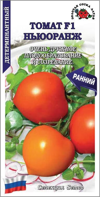 Ранний гибрид для пленочных теплиц и открытого грунта. От всходов до созревания 90-95 дней. Растение детерминантное, хорошо облиственное, компактное. Плоды оранжевые, без зелёного пятна у плодоножки, округлой формы с носиком, массой 100-130 г, плотные, отличных вкусовых качеств. Гибрид устойчив к заболеваниям, жаре и засухе, отличается высокой дружностью плодообразования и созревания. Используется в салатах, для непосредственного потребления и переработки на томатопродукты, прекрасно подходит для консервирования.
