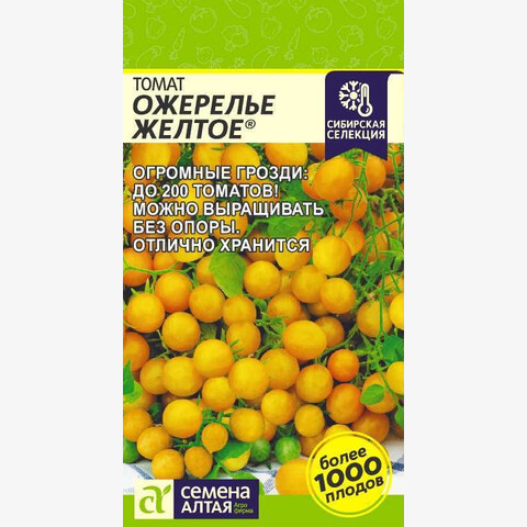 Селекция Агрофирмы Семена Алтая. Среднеспелый (115-117 дней) индетерминантный сорт с огромными кистями вишневидных ярко-желтых плодов, массой 5-7 г (до 10 г), с прекрасными вкусовыми качествами, с повышенным содержанием витамина С и сухого вещества. Выращивать в открытом грунте или пленочных, остекленных теплицах. Плоды используются в свежем виде, для консервирования и засолки. Плоды, собранные целыми кистями, хранятся до 1,5-2 месяцев. Место посадки: легкие плодородные нейтральные почвы. Выращивают после моркови, капусты, свеклы, бобовых и тыквенных культур Освещение: обильное, переносит легкое затенение Предпосевная подготовка: для стимулирования прорастания перед посевом семена томата замочить на 15 минут в 1% растворе марганцовки, затем промыть и подсушить Сроки посева: среднеспелые сорта высевают за 60-70 дней до высадки (март) Посев на рассаду: высевают на слегка утрамбованный грунт, мульчируют торфом или почвенным слоем 1 см, уплотняют, обильно поливают теплой водой, накрывают пленкой и ставят в теплое (около 25°С) место. После появления всходов пленку снимают, рассаду размещают в светлом месте. В течение 5-7 суток температуру поддерживают на уровне 15-16°С, затем повышают до 20-22°С Посев в грунт: не предусмотрено для большинства регионов Пикировка/перевалка: в фазе 1-2 настоящих листьев рассаду пикируют. В фазе 9-10 настоящих листьев высаживают в защищенный или открытый грунт с соблюдением посадочного расстояния 40х40 см Уход: индетерминантные томаты формируют в 1-2 стебля, удаляя пасынки. При достижении растениями верха теплицы или формировании 6-7 кистей основной стебель прищипывается. В период налива плодов рекомендуется произвести калийную подкормку Сбор урожая: собирают в течение сезона по мере созревания. Недозревшие плоды в фазе бланжевой и молочной спелости могут дозариваться не на растении