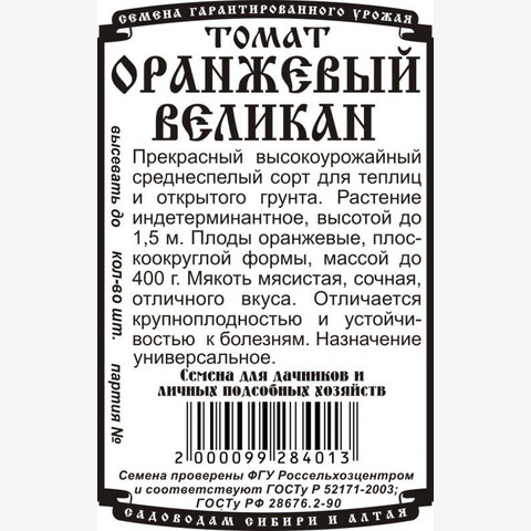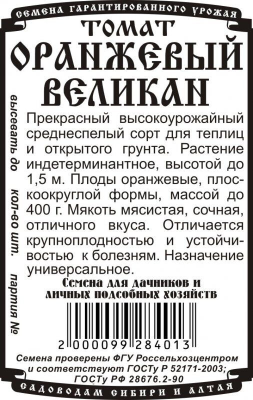 Прекрасный высокоурожайный среднеспелый сорт для теплиц и открытого грунта. Растение индетерминантное, высотой до 1,5 м. Плоды оранжевые, плоскоокруглой формы, массой до 400 г. Мякоть мясистая, сочная, изысканного вкуса. Отличается крупноплодностью и устойчивостью к болезням. Назначение универсальное.