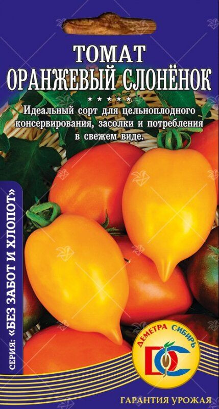 Среднеспелый (105-115 дней) холодостойкий сорт. Кусты детерминантные, высотой 55-60 см, пасынки короткие, от обилия плодов - полегают, требуется подвязка. Плоды округлые, с красивым носиком, насыщенного оранжевого цвета, массой 100-150 гр, мясистые, очень сладкие. Плодоношение стабильное и длительное, при любых погодных условиях. Вынослив к пониженной освещенности и устойчив к комплексу болезней. Идеальный сорт для цельноплодного консервирования, засолки и потребления в свежем виде.