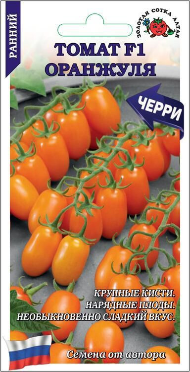 Гибрид ранний (93-95 дней), очень урожайный, характеризуется высокой устойчивостью к комплексу заболеваний и повышенным содержанием каротина, ликопина и сахаров. Растение индетерминантное, требует подвязки и формирования в 1 стебель. Плоды красивого янтарно-оранжевого цвета, овально-кубовидные, массой 20-25 г, собраны в полусложные кисти до 30 шт в каждой. Мякоть сочная и нежная, великолепного сладкого вкуса. Используют в свежем виде, для приготовления салатов, украшения блюд и цельноплодного консервирования.