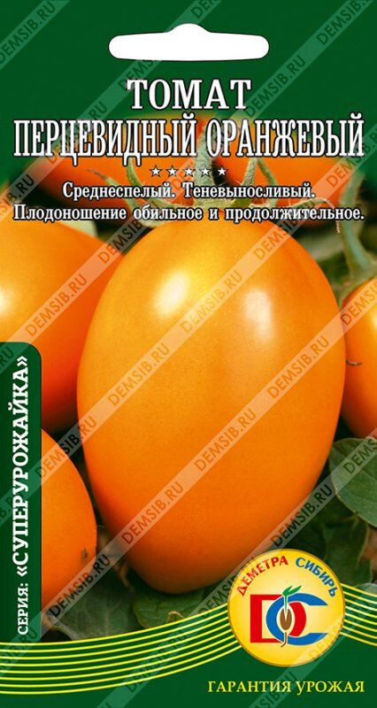 Популярный урожайный среднеспелый (110-115 дней) сорт, для открытого и закрытого грунта. Растение индетерминантное, высотой до 1,8 м, требует подвязки и формирования в 1-2 стебля. Плоды овально-цилиндрические, гладкие, оранжевые, мясистые, с сахаристой-маслянистой мякотью, массой 140-160 г. Вкус отличный, томаты сладкие и сочные. Используют для приготовления деликатесных салатов, переработки и консервирования. Сорт устойчив к основным заболеваниям, долго сохраняет вкусовые и товарные качества.