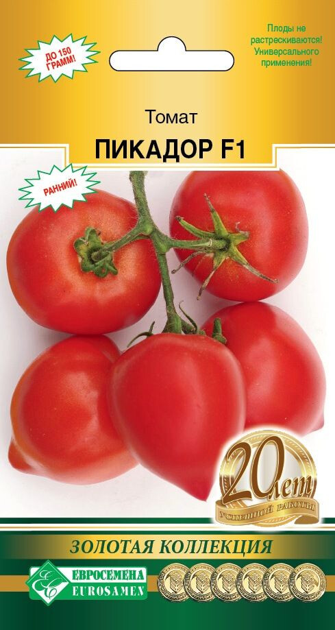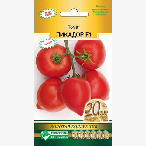 Трудно найти человека, который бы не любил томаты. Один только вид блестящих красных, оранжевых, желтых, двухцветных томатов вызывает аппетит и поднимает настроение. Помидор в переводе с итальянского языка означает золотое яблоко. С точки зрения ботаники томаты — это ягоды, но их относят к фруктам. Ведь по ботанической классификации сочные плоды с семенами внутри, развивающиеся из цветка, являются фруктами. Пикадор- раннеспелый детерминантный гибрид высотой до 1 м. От всходов до плодоношения — 95-100 дней. Первое соцветие - над 7-8 листом, последующие — через 1-2 листа. Кисти простые с 3-5 округлыми глянцевыми плодами насыщенного красного цвета с носиком. Масса плодов — 140-150 г. Вкусовые качества плодов очень высокие. Мякоть плотная, приятной консистенции, с легкой кислинкой. Гибрид отлично хранится и транспортируется. Плоды не растрескиваются, пригодны для свежего потребления, всех видов консервирования и засолки. Рекомендуется формировать растения в 3-4 стебля.