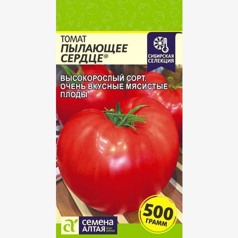 Селекции Агрофирмы Семена Алтая. Среднеранний индетерминантный сорт. Плоды округло-сердцевидной формы, ровные, крупные, красно-малиновые при созревании, массой 240-360 г, до 500 г. Очень вкусные, мясистые плоды великолепны в салатах, отлично подходят для изготовления соков. Место посадки: легкие плодородные нейтральные почвы. Выращивают после моркови, капусты, свеклы, бобовых и тыквенных культур Освещение: обильное, переносит легкое затенение Предпосевная подготовка: для стимулирования прорастания перед посевом семена томата замочить на 15 минут в 1% растворе марганцовки, затем промыть и подсушить Сроки посева: раннеспелые сорта высевают за 45-55 дней до высадки (март) Посев на рассаду: высевают на слегка утрамбованный грунт, мульчируют торфом или почвенным слоем 1 см, уплотняют, обильно поливают теплой водой, накрывают пленкой и ставят в теплое (около 25°С) место. После появления всходов пленку снимают, рассаду размещают в светлом месте. В течение 5-7 суток температуру поддерживают на уровне 15-16°С, затем повышают до 20-22°С Посев в грунт: не предусмотрено для большинства регионов Пикировка/перевалка: в фазе 1-2 настоящих листьев рассаду пикируют. В фазе 9-10 настоящих листьев высаживают в защищенный или открытый грунт с соблюдением посадочного расстояния 40х40 см Уход: индетерминантные томаты формируют в 1-2 стебля, удаляя пасынки. При достижении растениями верха теплицы или формировании 6-7 кистей основной стебель прищипывается. В период налива плодов рекомендуется произвести калийную подкормку Сбор урожая: собирают в течение сезона по мере созревания. Недозревшие плоды в фазе бланжевой и молочной спелости могут дозариваться не на растении