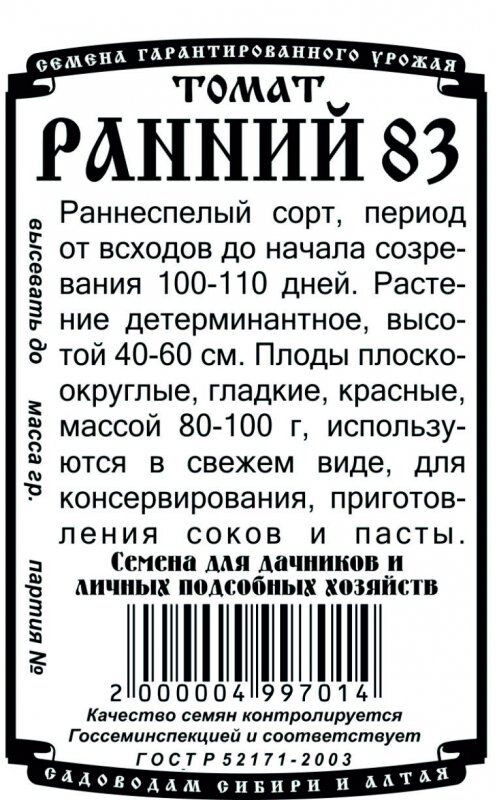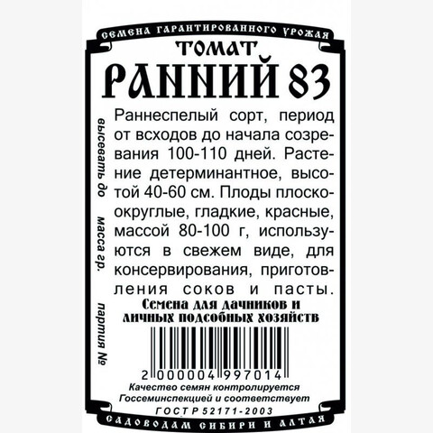 Томат Ранний 83 15 шт Б/П/ Деметра