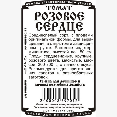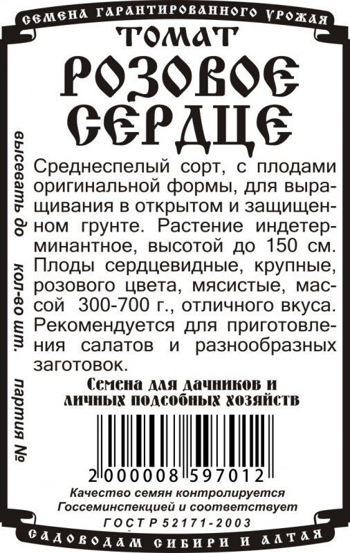 Среднеспелый сорт, с плодами оригинальной формы, для выращивания в открытом и защищенном грунте. Растение индетерминантное, высотой до 150 см. Плоды сердцевидные, крупные, розового цвета, мясистые, массой 300-700г., отличного вкуса. Рекомендуется использовать для приготовления салатов и разнообразных заготовок