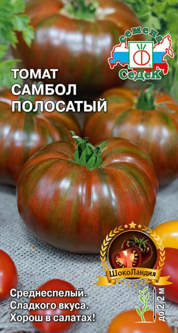 Среднеспелый (110-115 дней) сорт салатного назначения для выращивания в теплицах и под пленочными укрытиями. Растение индетерминантное, среднеоблиственное, высотой до 2,2 м. В кисти формирует до 5 плодов. Плоды плоскоокруглые, крупные, слегка ребристые, массой 200-300 г, до 500 г. Незрелый плод – зеленый с темно-зелеными полосками, при созревании – коричневый с темно-зелеными полосками, кожица тонкая, мякоть мясистая, сочная, нежная, сладкого вкуса. Ценность сорта: крупноплодность, великолепные вкусовые качества, декоративность плодов, сочетание высокого содержания антиоксидантов, ликопина, витамина С способствует укреплению сердечно-сосудистой системы, иммунитета, имеет свойства афродизиаков. Рекомендуется для употребления в свежем виде, домашней кулинарии, переработки на соки.