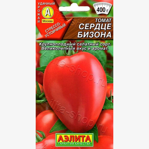 Удачный салатный сорт. Вступает в плодоношение в средние сроки, на 110-115 день от всходов. Ценится за великолепный вкус, крупноплодность, красивую форму. Вкус и аромат – наслаждение. Из красноплодных томатов по вкусу с данным сортом мало что сравнится. Растения среднерослые (1,5 м), детерминантные, слабооблиственные. Плоды красные, сердцевидные, мясистые, в меру сочные, малосемянные. Масса плода 180-400 г. Ввиду крупноплодности для баночной консервации не подходит. Рекомендуется переработка на сок. Устойчив к погодным стрессам. Урожайность 9-10 кг/м 2 .