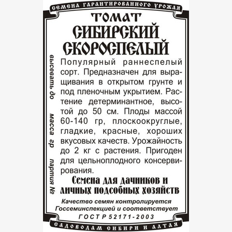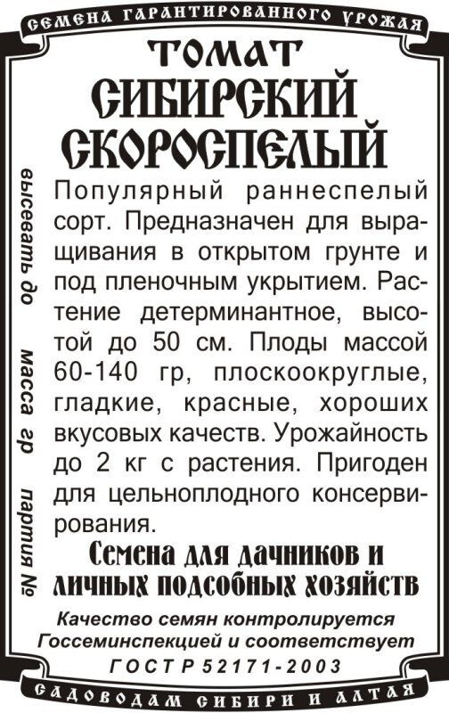 Популярный раннеспелый (95-105 дней) сорт с дружным созреванием плодов. Растение детерминантное, высотой 30-50 см. Плоды округло-плоские, гладкие, красные, массой до 100 г, плотные, устойчивы к растрескиванию, отличного вкуса. Рекомендуются для потребления в свежем виде, консервирования и приготовления томатопродуктов.
