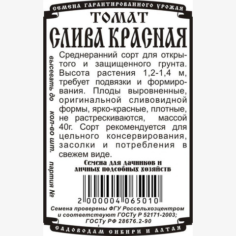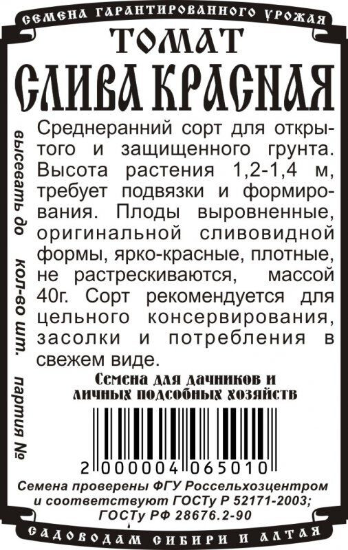 Среднеранний сорт для открытого и защищенного грунта. Высота растения 1,2-1,4 м, требует подвязки и формирования. Плоды выровненные, оригинальной сливовидной формы, ярко-красные, плотные, не растрескиваются, массой 40г. Сорт рекомендуется для цельного консервирования, засолки и потребления в свежем виде.