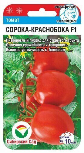 Сибирский гибрид для открытого грунта Отличная урожайность и товарность Высокая устойчивость к болезням Кистевой скороспелый гибрид для открытого грунта. Созревание первых плодов на 105-110 день после появления всходов. Растение низкорослое, высотой 50-60 см, не требует большого ухода, с минимальным пасынкованием. Кисти обильные, с 5-7 красивыми однородными плодами. Первая завязывается над 7 листом, последующие через 2 листа. Плодоношение дружное, сбор товарных плодов 2-3 раза в неделю. Плоды гладкие, овальной формы, красного цвета без зеленого пятна у плодоножки. Масса томатов на первых кистях 140г, на последующих 80-90г. Вкус отличный. Идеально подходят для любого вида консервирования, хороши в свежих салатах. Хорошо дозариваются и длительно хранятся без потери товарного вида. Гибрид устойчиво к вершинным гнилям и к фитофторозу. Урожайность до 10 кг/м2.