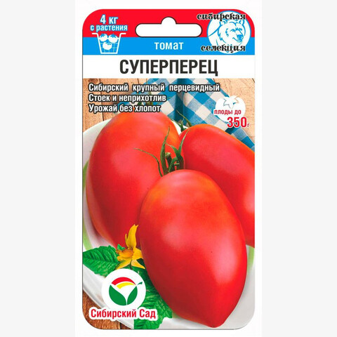Сибирский крупный перцевидный Стоек и неприхотлив Урожай без хлопот Среднеранний сорт (созревает на 112 день после появления всходов) для любителей выращивать без хлопот крупные томаты в открытом грунте. Достаточно устойчив к ранним краткосрочным заморозкам. Куст низкорослый, крепкий, пасынкуется только до первой кисти. Густо-красные плоды перцевидной формы весом 300-350 г дружно созревают и красиво украшают невысокий куст. Томаты приятного вкуса, сахаристые с легкой кислинкой, плотные, но не жесткие. Хороши в свежем виде, подходят для соков, домашней кулинарии, более мелкие плоды - для консервации и засола.