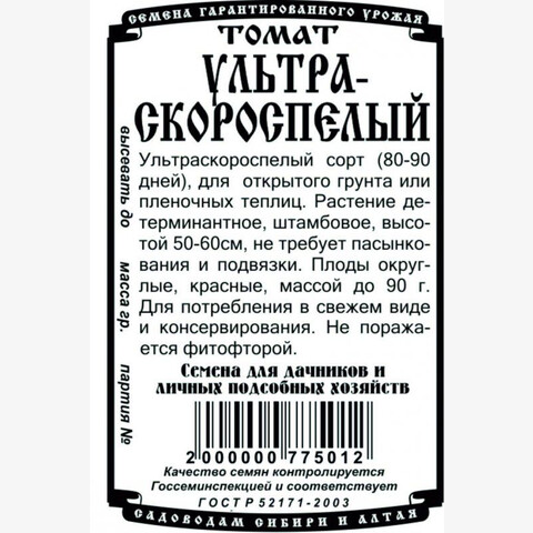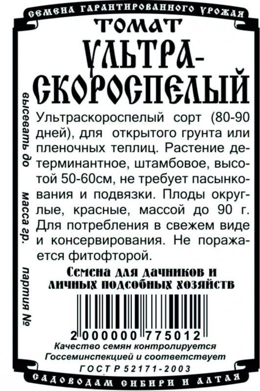 Ультраскороспелый сорт (80-90 дней), для открытого грунта или пленочных теплиц. Растение детерминантное, штамбовое, высотой 50-60см, не требует пасынкования и подвязки. Плоды округлые, красные, массой до 90г. Для потребления в свежем виде и консервирования. Не поражается фитофторой.