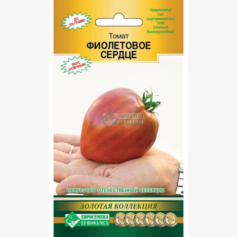 Трудно найти человека, который бы не любил томаты. Один только вид блестящих красных, оранжевых, желтых, двухцветных томатов вызывает аппетит и поднимает настроение. Помидор в переводе с итальянского языка означает золотое яблоко. С точки зрения ботаники томаты — это ягоды, но их относят к фруктам. Ведь по ботанической классификации сочные плоды с семенами внутри, развивающиеся из цветка, являются фруктами. Помидоры вкусны и полезны! Фиолетовое сердце - среднеспелый, салатный сорт для выращивания в плёночных теплицах и под временными плёночными укрытиями в ЛПХ. Растение индетерминантного типа. Лист средней длины, зелёной окраски. Соцветие сложное. Плодоножка с сочленением. Плод сердцевидной формы, средней плотности, средне ребристый. Окраска незрелого плода - зелёная с тёмно-зелёным пятном у плодоножки, зрелого плода - фиолетово-красная. Число гнезд - более 6. Масса плода - 270 г. Вкус хороший. Урожайность товарных плодов в поликарбонатных теплицах составила 18,0 кг/кв.м.