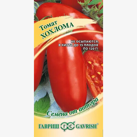 Семена Томат Хохлома. Среднепоздний (120-125 дней от всходов до плодоношения) индетерминантный (с неограниченным ростом) гибрид, рекомендован для пленочных и остекленных теплиц. Посев на рассаду в конце февраля – начале марта. Пикировка в фазе первого настоящего листа. В период выращивания рассады необходима досветка. Высадка рассады в теплицы в конце апреля в возрасте 50-55 дней. Обязательна подвязка растений через несколько дней после посадки. Первое соцветие закладывается над 11-12-м листом, затем они следуют через 3 листа. Необходимо проводить прищипку соцветий, оставляя не более 4-5 цветков. Формируют в один стебель, удаляя все «пасынки» и нижние листья, а так же прищипывают точку роста в конце вегетации. Плоды перце видной формы, массой 180-220 г. Благодаря великолепному вкусу, незаменим для приготовления свежих летних салатов. Схема посадки 40х60 см. Урожайность одного растения 4,5-5,0 кг.