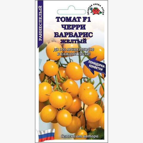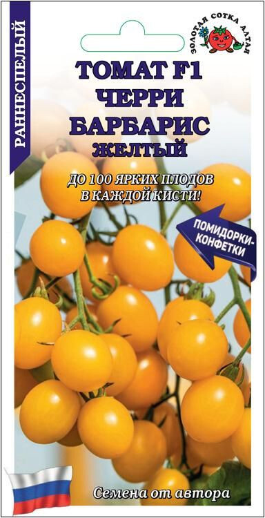 Один из наиболее ярких вишневовидных гибридов. Раннеспелый (85-90 дней), индетерминантный, высокоурожайный, формирует 5-7 массивных кистей с огромным количеством помидорок – до 100 шт в каждой. Плоды округлой формы, массой 10-15 г, жёлтые, плотные, с необычным сладковато-конфетным вкусом, прекрасно подходят для потребления в свежем виде, приготовления салатов, украшения различных блюд и консервирования. Превосходная декоративность превращает этот томат в яркое украшение любой грядки или приусадебного участка.