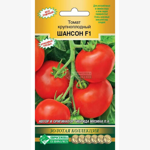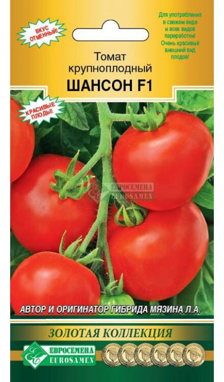 Автор и оригинатор гибрида Мязина Л.А. Для употребления в свежем виде и всех видов переработки! Очень красивый внешний вид плодов! Трудно найти человека, который бы не любил томаты. Один только вид блестящих красных, оранжевых, желтых, двухцветных томатов вызывает аппетит и поднимает настроение. Помидор в переводе с итальянского языка означает золотое яблоко. С точки зрения ботаники томаты — это ягоды, но их относят к фруктам. Ведь по ботанической классификации сочные плоды с семенами внутри, развивающиеся из цветка, являются фруктами. Шансон F1 -раннеспелый ( 95-105 дн) гибрид первого поколения салатного назначения для выращивания в открытом грунте и пленочных теплицах в ЛПХ. Растение индетерминантное. Плод плоскоокруглой формы, крупный, среднеребристый, плотный. Окраска незрелого плода- светло-зеленая, зрелого - красная. Число гнезд – 4-6, масса плода - 350 г. Отличный вкус. Товарная урожайность в пленочных теплицах составила 12,1кг/кв.м. Можно выращивать в 2-3 стебля, с пасынкованием и подвязкой. В конце вегетации верхушку куста нужно обрезать, оставив над кистью 2 листа.