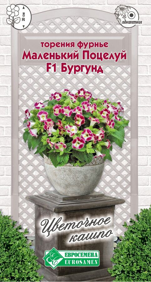 Торения (семейство Норичниковые) выделяется своим оригинальным внешним видом среди огромного количества цветочных культур и представляет собой плотный компактный округлый кустик, покрытый красивыми цветками необычной окраски. Она получила широкое распространение в наших краях. Родиной этой экзотической красавицы являются африканские тропики. Растение культивируется как однолетник и привлекает внимание своими оригинальными соцветиями, по форме напоминающими колокольчик, выделяющимися на фоне яркой зелени листьев и отлично гармонирующими с садовыми и комнатными цветущими и лиственными растениями. Маленький Поцелуй - компактная, однородная серия торении с прекрасными характеристиками при посадке в цветники открытого грунта, в большие контейнеры, в качестве компонента в смешанные комбинации, идеально подходит для высадки в кашпо. По красоте цветения ей нет равных, непрерывно цветет на полном солнце и в полутени. Отличается хорошим базальным ветвлением, компактностью растений и не требует регуляторов роста.