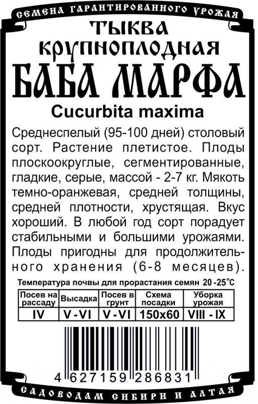 Среднеспелый (95-100 дней) столовый сорт. Растение плетистое, главная плеть средней длины. Плоды плоскоокруглые, сегментированные, гладкие, серые, массой - 2-7 кг. Мякоть темно-оранжевая, средней толщины, средней плотности, хрустящая. Вкус хороший. В любой год сорт порадует стабильными и большими урожаями. Плоды пригодны для продолжительного хранения (6-8 месяцев).