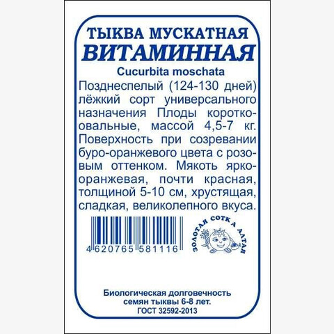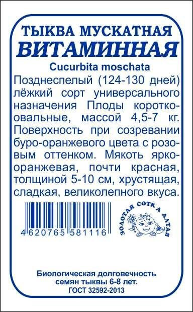 Сорт позднеспелый, высокоурожайный, универсального назначения. Срок созревания 124-130 дней. Растение длинноплетистое, средней мощности. Плоды короткоовальные, широкие, сегментированные, массой 4,5-7 кг. Кора тонкая. Окраска поверхности при созревании буро-оранжевая с розовым оттенком. Мякоть ярко-оранжевая, почти красная, толщиной 5-10 см, хрустящая, сладкая, великолепного вкуса и аромата.