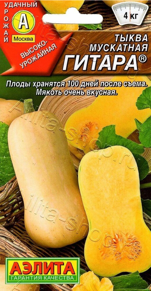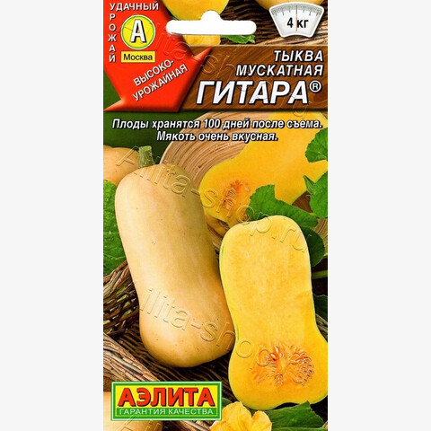 Высокоурожайный сорт с отличной лёжкостью плодов – до 100 дней. Период от всходов до съема плодов составляет 110-120 дней. Плоды массой 2-4 кг, по внешнему виду напоминают гитару. Мякоть очень сладкая, сочная, хрустящая, ароматная, богата клетчаткой, витаминами, полезными минералами и каротином. Дегустационная оценка – 4,9 балла по 5-балльной шкале. Из неё получается вкуснейшая начинка для пирогов и аппетитные цукаты. Средняя урожайность – 6-10 кг/м2.
