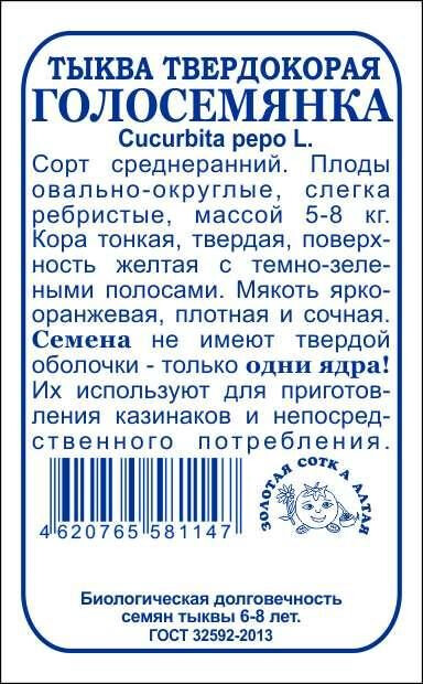 • Уникальный среднеранний сорт с хорошей лежкостью и транспортабельностью. От всходов до сбора урожая около 120 дней. Плоды овально-округлые, слегка ребристые, массой 5,0-8,0 кг, желтые с темно-зелеными полосами. Кора тонкая, твердая. Мякоть ярко-оранжевая, плотная, сочная. Семена не имеют твердой оболочки, только ядра! Их используют для приготовления казинаков и непосредственного потребления. Плоды используют в кулинарии.