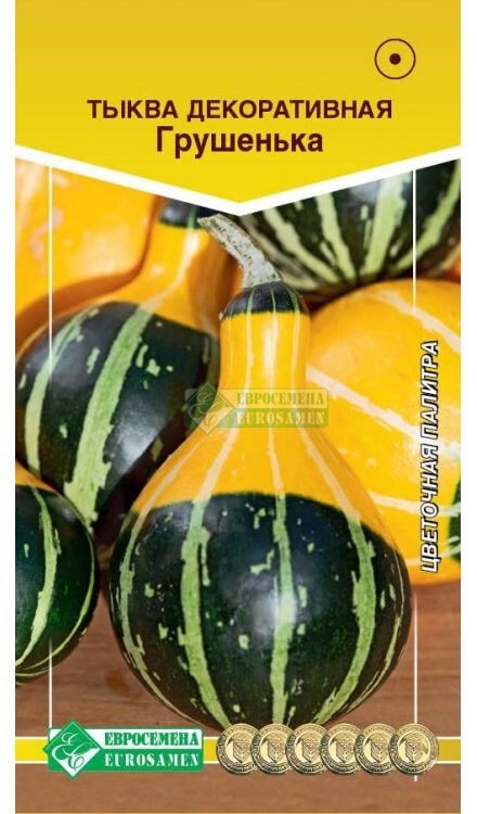 Изумрудные лианы, густо оплетающие прутья заграждения или ажурную беседку, огненные фигурные плоды разнообразных оттенков — необыкновенное украшение сада, парка, зоны отдыха, приусадебного участка. Многим цветоводам декоративная тыква нужна на балконах и городских террасах. Из плодов мастерят необыкновенные элементы для украшения интерьера. Декоративные тыквы используются для озеленения веранд, арок, беседок, кустовые формы превосходно смотрятся в цветниках, клумбах, затейливых контейнерах. Стволы аккуратно приподнимают и создают неотразимые живые композиции, украшают двери, столбики с фонарями, приствольную зону деревьев, стены. Пик декоративности наступает с цветением и созреванием. В середине лета притягивают взоры крупные солнечные бутоны. К осени вместо них уже красуются плоды необыкновенной формы и красочных оттенков. Это выглядит привлекательно и радует глаз. Грушенька- двухцветный сорт декоративной тыквы с грушевидными плодами уникальной окраски (сочетание зелено-желтого и зелено-оранжевого) и контрастной границей окрасок на кожуре. Из нее можно вырезать декоративные подсвечники, чаши, вазы, оригинальные шкатулки. Высота растения-300-400 см