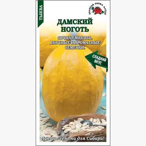 Среднеспелый урожайный сорт. От всходов до плодоношения 110-115 дней. Растение кустового типа. Плоды желтого цвета, удлиненно-овальные, массой 3-4 кг, кора твердая. Мякоть плотная, сочная, очень хорошего сладковатого вкуса. Семенная камера большая. Семечки вкусные и ароматные, подходят для употребления в сыром и жареном виде. Сорт широко используется в кулинарии, ценится за высокий урожай масличных семян.