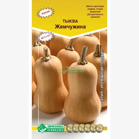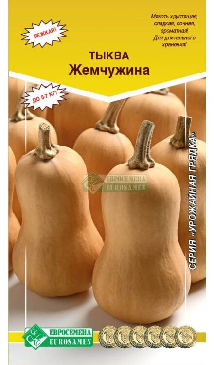 Среднеспелый сорт с великолепным вкусом! Сладкая, ароматная мякоть! Период от всходов до полного созревания плодов 115-130 дней. Главная плеть длинная. Плоды удлиненно-грушевидной формы, желто-оранжевого цвета, при созревании оранжево-зеленоватого. Мякоть томно-оранжевая, плотная, хрустящая, сладкая, сочная, с высоким содержанием каротина. Плоды хорошо хранятся зимой. Отличается компактным расположением семян в небольшой семенной камере. Масса плода 5-7 кг. Сорт столового назначения. Тыква Жемчужина является наиболее богатым источником каротина. Используется в выпечке, для изготовления пюре и соков.