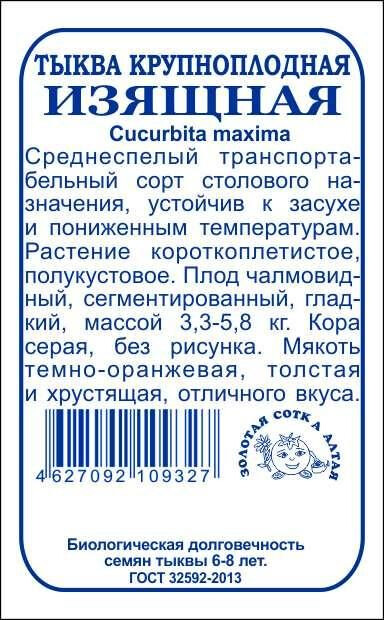 • Среднеспелый транспортабельный сорт столового назначения, устойчив к засухе и пониженным температурам. Растение короткоплетистое, полукустовое. Плод чалмовидный, сегментированный, гладкий, массой 3,3-5,8 кг. Кора серая, без рисунка. Мякоть темно-оранжевая, толстая и хрустящая, отличного вкуса.