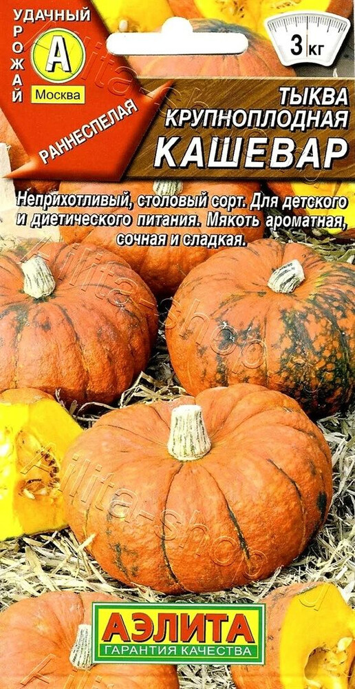 Раннеспелый столовый сорт с красивыми и очень вкусными плодами. Урожай начинают убирать на 85-100 день после всходов. На каждом растении формируется до 8 плодов. Тыквы выравненные по форме и размеру, массой 2-3 кг. Мякоть оранжевого цвета, хрустящая, плотная, сладкая и сочная. Содержит много каротина и сахаров. Семенное гнездо небольшое. После сбора плоды хранятся до середины зимы, в процессе хранения становятся слаще и вкуснее. Сорт холодостойкий, неприхотливый, высокоурожайный. Один из лучших для сладкой выпечки, диетического питания и получения сока.