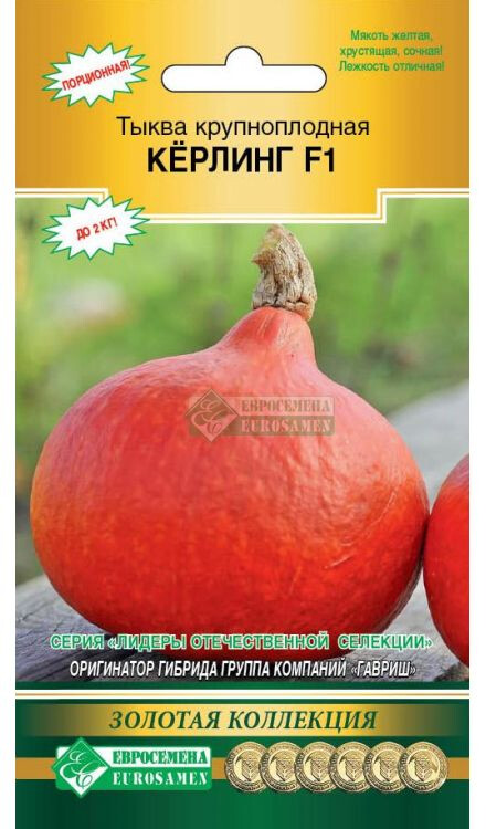 Тыква — это бахчевая культура с уникальным витаминным составом и низкой калорийностью. Этот овощ, плод которого ботаники называют ягодой, в России считается одним из любимых огородных растений. Важной кулинарной особенностью тыкв считается их способность почти полностью сохранять свои полезные свойства и после термической обработки. Керлинг F1 - среднеспелый гибрид крупноплодной тыквы с отличными вкусовыми качествами красивых плодов. Рекомендуется для выращивания в открытом грунте. Это порционная тыква для личного применения, реализации на рынке и в торговых сетях. Отлично подходит для всех видов термической обработки: запекания, тушения, заморозки, использования в качестве горшочка для приготовления вторых блюд. Плоды массой 1,5-2 кг плоско округлые, темно-оранжевые, которые могут храниться до 180 дней. Мякоть желтая, средней толщины, хрустящая, сочная. Растение формирует длинные побеги.