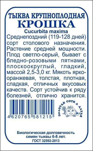 Среднепоздний (119-128 дней) сорт столового назначения. Растение средней мощности. Плод светло-серый, бывает с бледно-розовыми пятнами, плоскоокруглый, гладкий, массой 2,5-3,0 кг. Мякоть ярко-оранжевая, толстая, плотная, сладкая, отличных вкусовых качеств. Сорт устойчив к ряду болезней, отлично хранится.