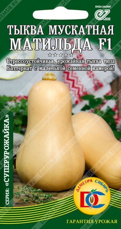 Щедрый подарок осени. Великолепный, стрессоустойчивый, среднеспелый (105-120 дней) гибрид мускатной тыквы - баттернат. Плоды удлинённо-грушевидной или булавовидной формы с лёгкой перетяжкой, обозначающей "талию", гладкие, горчично-жёлтые, массой 3,5-5 кг. Мякоть толстая, оранжевая, крахмалистая, плотной маслянистой консистенции, средней сочности, отличного сладкого вкуса, ароматная. Прекрасно транспортируется и сохраняет высокие товарные качества до 4 месяцев после съёма.