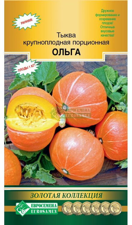 Тыква — это бахчевая культура с уникальным витаминным составом и низкой калорийностью. Этот овощ, плод которого ботаники называют ягодой, в России считается одним из любимых огородных растений. Важной кулинарной особенностью тыкв считается их способность почти полностью сохранять свои полезные свойства и после термической обработки. Ольга- порционная тыква отечественной селекции. Раннеспелый сорт, с дружным формированием и созреванием плодов. Первые тыквины готовы к съёму через 85-100 дней от всходов. Растение полукустовое; главная плеть не превышает 1,2 м в длину. На одном растении одновременно формируется от 4-х до 10 небольших плодов рыночного типа, средней массой 1 кг. Плоды такого размера удобны в использовании. Кора мягкая, чистится без усилий. Мякоть темно-оранжевая, толстая, хрустящая, сладкая на вкус. Семена мелкие, белые. Плоды хранятся до середины марта. ТЫКВА является наиболее богатым источником каротина. Не восприимчива к антракнозу, мучнистой росе, гнилям, фузариозному увяданию.