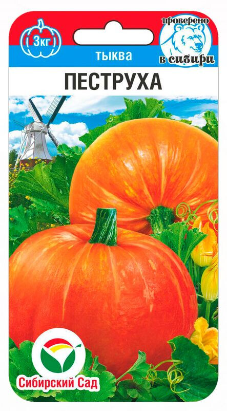 Среднеспелый сорт тыквы столового назначения с красиво-пестрыми плодами. Ценится за сладкую, сочную и вкусную мякоть порционных плодов, долгую сохранность товарных и вкусовых характеристик. Плоды хранятся 6-7 месяцев. Сорт выращивается в открытом грунте на садово-огородных участках во всех регионах РФ. Растение плетистое, средней длины. На кусту одновременно формируется 4-8 плодов. Тыквы плоскоокруглые, оранжевые со светлыми полосками до середины плода, массой 1,7-3 кг. Мякоть оранжевая, средней толщины, вкусная и сладкая. Семена белые, среднего размера. Мякоть используется для приготовления кулинарных блюд, вкусных соков и пюре. Выход товарной продукции - 93,7 %. Средняя урожайность - 386,0 ц/га. Для нормального вызревания на растении оставляют по 2-3 плода, прищипывая плети. Уборку плодов завершают до наступления заморозков.