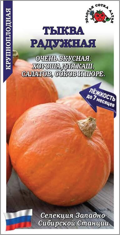 Среднеспелый урожайный сорт сибирской селекции. От всходов до созревания 90-95 дней. Растение плетистое. Плоды округлой формы, слабо сегментированные, массой 2,5-3,5 кг, красивого оранжевого цвета с розовым оттенком. Кора мягкая, но прочная. Мякоть оранжевая, толщиной 3-4 см, сладкая, высоких вкусовых качеств. Используют в свежем виде, в кулинарии и для переработки на соки, пюре, цукаты. Плоды хранятся 6-7 месяцев.