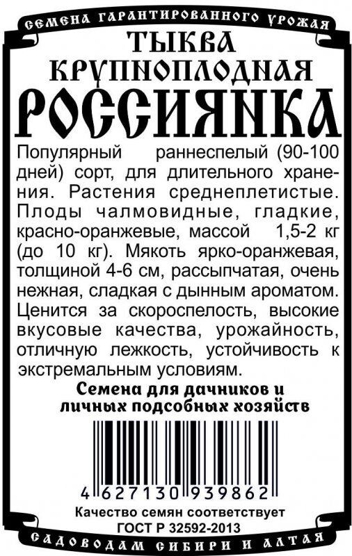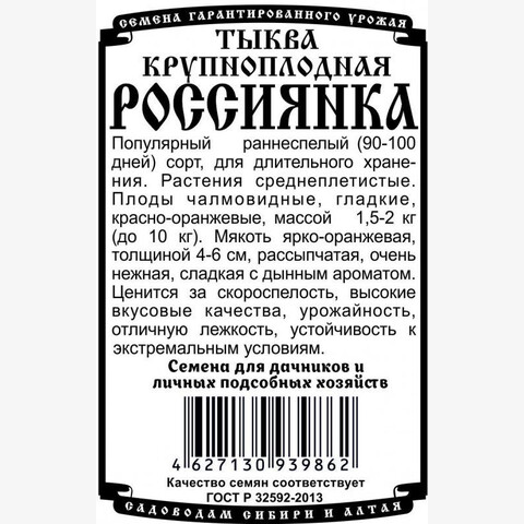 Популярный раннеспелый (90-100 дней) сорт, для длительного хранения. Растения среднеплетистые. Плоды чалмовидные, гладкие, красно-оранжевые, массой 1,5-2 кг (до 10 кг). Мякоть ярко-оранжевая, толщиной 4-6 см, рассыпчатая, очень нежная, сладкая с дынным ароматом. Ценится за скороспелость, высокие вкусовые качества, урожайность, отличную лежкость, устойчивость к экстремальным условиям.
