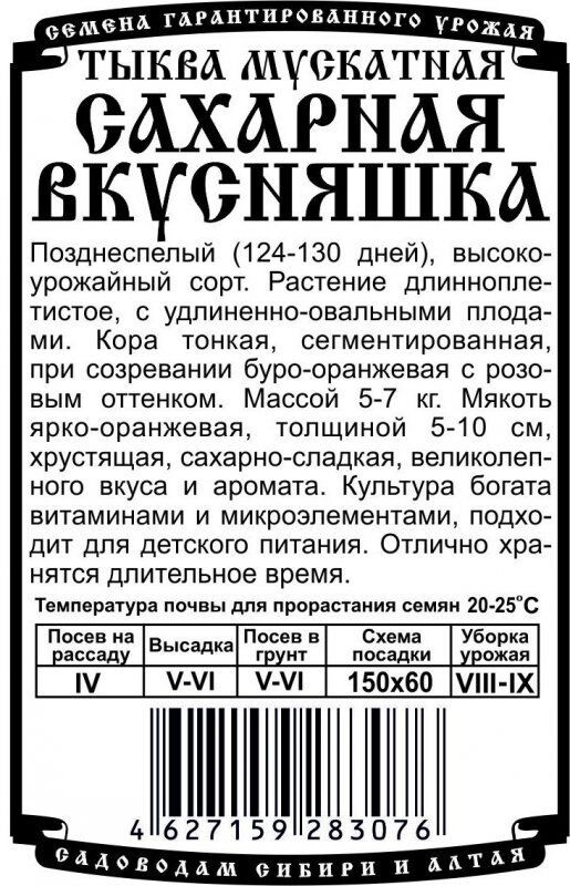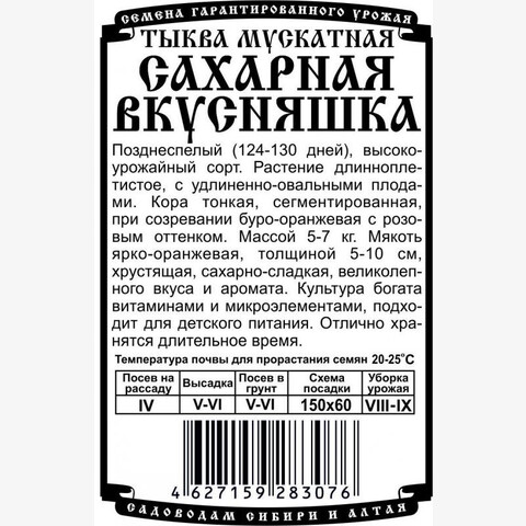 Позднеспелый (124-130 дней), высокоурожайный сорт. Растение длинноплетистое, с удлиненно-овальными плодами. Кора тонкая, сегментированная, при созревании буро-оранжевая с розовым оттенком. Массой 5-7 кг. Мякоть ярко-оранжевая, толщиной 5-10 см, хрустящая, сахарно-сладкая, великолепного вкуса и аромата. Культура богата витаминами и микроэлементами, подходит для детского питания. Отлично хранятся длительное время.