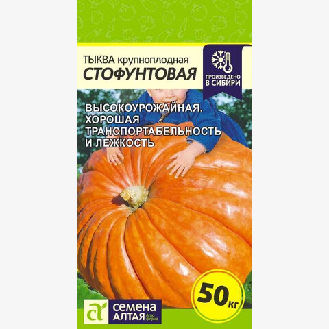 Среднепоздний (112-138 дней) урожайный сорт. Плоды шаровидные и короткоовальные, очень крупные, массой 10-20 кг и более (до 50 кг). Окраска поверхности плода розовая, желтая, оранжевая и серая. Кора тонкая, гибкая. Мякоть кремовая и желтая, рыхлая. Ценность сорта: высокая урожайность и кормовые качества плодов. Место посадки: легкие плодородные нейтральные почвы. Лучшие предшественники: картофель, лук, капуста, корнеплодные культуры и бобовые. Можно размещать на старых компостных кучах Освещение: освещенные участки, переносит легкое затенение Предпосевная подготовка: не требуется. Для улучшения всхожести выбирают семена возрастом 3-5 лет, замачивают в 1% растворе марганцовки на 15 минут Сроки посева: при прогревании почвы до 10-12°C, когда минует угроза возвратных заморозков Посев на рассаду: не предусмотрен Посев в грунт: высевают в открытый грунт по 2-3 штуки в лунку, когда почва прогреется до температуры 10-12°С на глубину 10 см и минует угроза возвратных заморозков. Глубина заделки семян 3-5 см, на легких почвах до 7 см. Посадочный интервал не менее 1 м между лунками с междурядьями 1,5 м. При раннем посеве в открытый грунт необходимо временное укрытие пленкой Пикировка/перевалка: не предусмотрено Уход: рыхление почвы и умеренные поливы. Для получения крупных плодов на растении оставляют по 2-4 завязи, а плети прищипывают. В период цветения-плодообразования проводят подкормку комплексным минеральным удобрением. Сбор урожая: убирают в полной спелости вместе с плодоножкой (август-сентябрь)