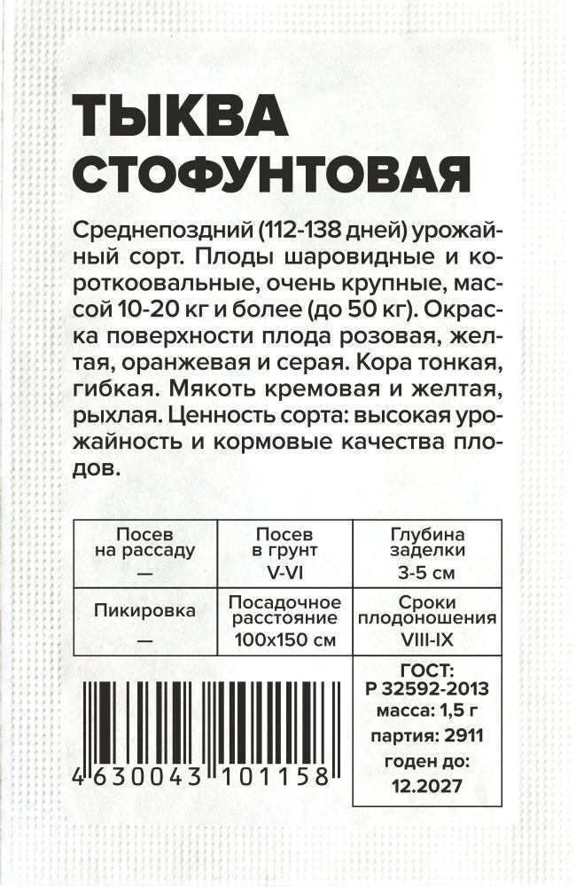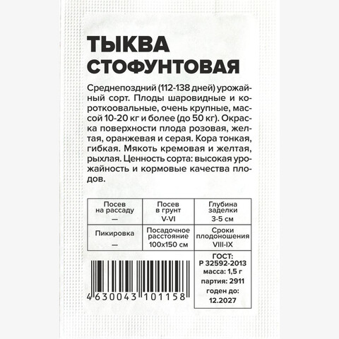 Среднепоздний (112-138 дней) урожайный сорт. Плоды шаровидные и короткоовальные, очень крупные, массой 10-20 кг и более (до 50 кг). Окраска поверхности плода розовая, желтая, оранжевая и серая. Кора тонкая, гибкая. Мякоть кремовая и желтая, рыхлая. Ценность сорта: высокая урожайность и кормовые качества плодов. Место посадки: легкие плодородные нейтральные почвы. Лучшие предшественники: картофель, лук, капуста, корнеплодные культуры и бобовые. Можно размещать на старых компостных кучах Освещение: освещенные участки, переносит легкое затенение Предпосевная подготовка: не требуется. Для улучшения всхожести выбирают семена возрастом 3-5 лет, замачивают в 1% растворе марганцовки на 15 минут Сроки посева: при прогревании почвы до 10-12°C, когда минует угроза возвратных заморозков Посев на рассаду: не предусмотрен Посев в грунт: высевают в открытый грунт по 2-3 штуки в лунку, когда почва прогреется до температуры 10-12°С на глубину 10 см и минует угроза возвратных заморозков. Глубина заделки семян 3-5 см, на легких почвах до 7 см. Посадочный интервал не менее 1 м между лунками с междурядьями 1,5 м. При раннем посеве в открытый грунт необходимо временное укрытие пленкой Пикировка/перевалка: не предусмотрено Уход: рыхление почвы и умеренные поливы. Для получения крупных плодов на растении оставляют по 2-4 завязи, а плети прищипывают. В период цветения-плодообразования проводят подкормку комплексным минеральным удобрением. Сбор урожая: убирают в полной спелости вместе с плодоножкой (август-сентябрь)