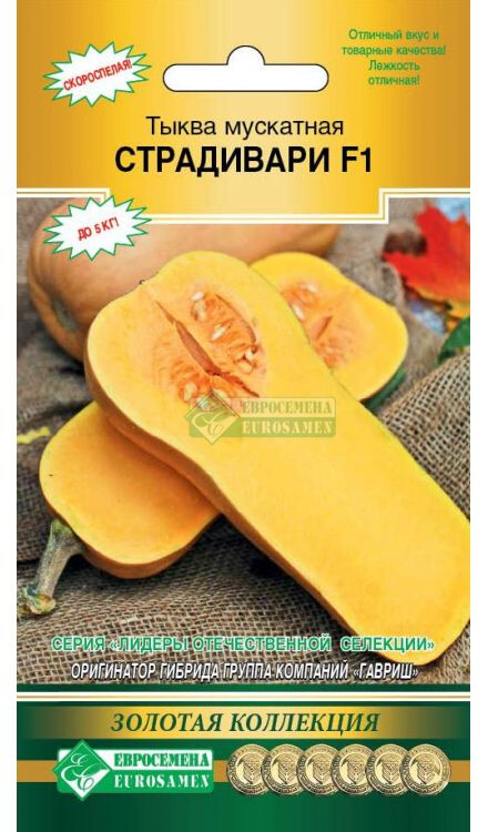 Тыква – полезный для здоровья продукт питания, который по праву можно назвать природным поливитамином. Все вещества, входящие в состав яркой мякоти, не теряют своей пользы даже в процессе термической обработки. Еще в былые времена, когда такие сладости, как мороженое и шоколадные конфеты, были редкостью, кусочек запеченной сладкой тыквы считался настоящим лакомством. Страдивари F1 - скороспелая мускатная тыква (тип Баттернат). Период от полных всходов до получения урожая 91-130 дней. Плоды, массой 2,3-4,6 кг, цилиндрической формы, слабо сегментированные, с гладкой поверхностью, бурые. Мякоть красно-оранжевая, нежная, сладкая. Отлично подходит для всех видов термической кулинарной обработки: запекания, тушения, заморозки. Растения средне петлистые. Сила роста средняя. Гибрид устойчив к настоящей мучнистой росе. Хорошо хранится и транспортируется. Отличный вкус и товарные качества.