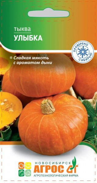 Сорт кустовой, скороспелый. Масса плода 0,7-1,0 кг, сами плоды образуются рядом со стеблем, форма шарообразная, слегка приплюснутая с боков. На каждом кусте формируется до 6 побегов, длиной не более 1 м, количество плодов от 7 до 10 штук. Кора и мякоть насыщенного оранжевого оттенка, с наличием полос, мякоть сочная с небольшим количеством семян, сладкая, с ароматом дыни. В процессе хранения вкусовые качества только улучшаются. Кустовая форма растения позволяет выращивать тыкву Улыбка, на небольших земельных участках. Особенности выращивания: если осенью почва становится слишком влажной, под плоды рекомендуется подкладывать плоские камни или дощечки для лучшего вызревания. Уборку плодов завершают до наступления заморозков. - IV V-VI V-VI 120x120 VIII